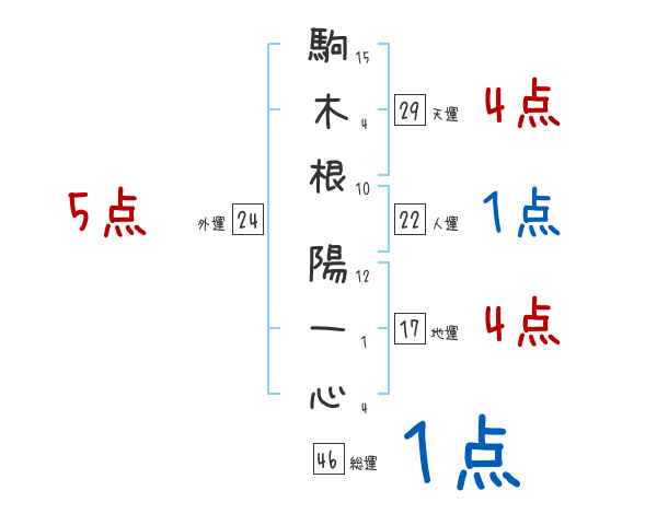 天運![]() | 駒木根陽一心さんの天運は29画の4つ星!完全主義で才能がある。厳格な心の持ち主。 家系が持つ宿命的な運勢を表します。祖先から受け継いだ苗字ですので自分の力が及びません。家柄を象徴します。 |