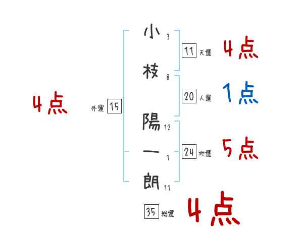 天運![]() | 小枝陽一朗さんの天運は11画の4つ星!着実に富や地位を得る幸運な人生。 家系が持つ宿命的な運勢を表します。祖先から受け継いだ苗字ですので自分の力が及びません。家柄を象徴します。 |