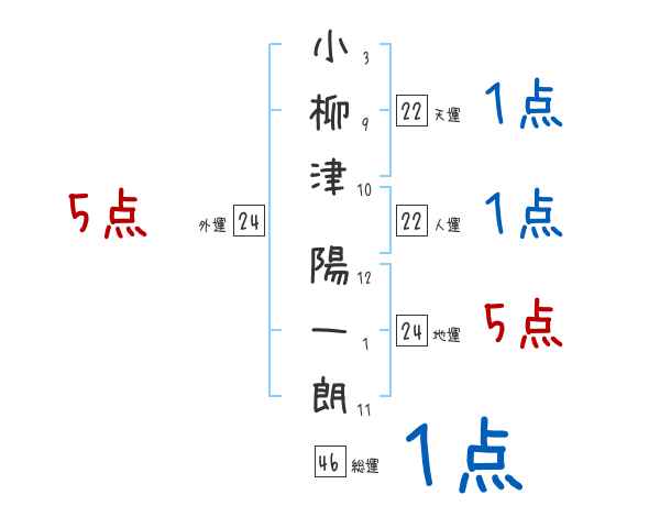 人運![]() | 小柳津陽一朗さんの人運は22画の1つ星!努力することが苦手ないっぽう手先が器用。芸術性にも優れる。 性格や才能などを表す2番目に重要な運勢です。人間関係や協調性、社会的な成功に影響します。主に20歳から50歳ぐらいまでの中年期の運勢を表します。 |