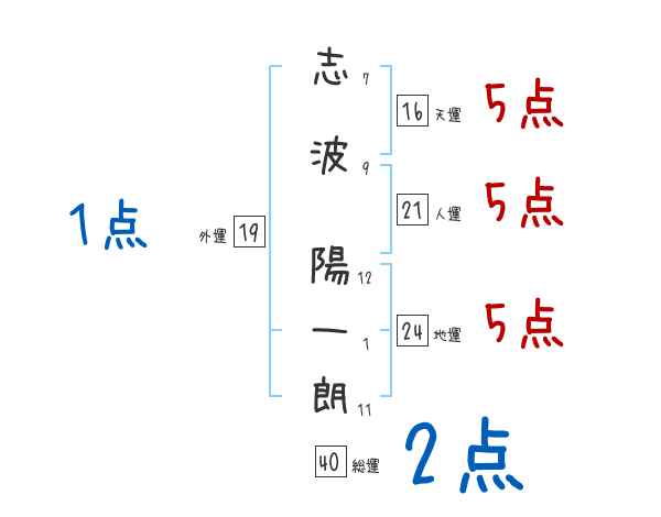 外運![]() | 志波陽一朗さんの外運は19画の1つ星!優れた才能を持ちますが、協調性が足りないことも。周りの人と協力する事を意識しましょう。 生活面を象徴する運勢です。外部から受ける影響力を表し、結婚運、家庭運や職場、環境への順応性を表します。 |