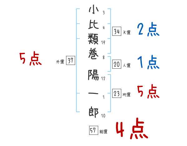 外運![]() | 小比類巻陽一郎さんの外運は37画の5つ星!努力家で順応性に優れる。現実的な考え方ができ忠実に物事をこなす。 生活面を象徴する運勢です。外部から受ける影響力を表し、結婚運、家庭運や職場、環境への順応性を表します。 |
