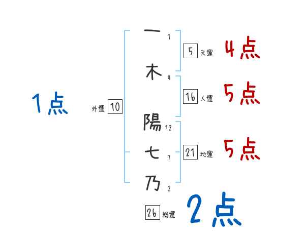 人運![]() | 一木陽七乃さんの人運は16画の5つ星!人望が厚く大きく発展する。逆転成功が見える。 性格や才能などを表す2番目に重要な運勢です。人間関係や協調性、社会的な成功に影響します。主に20歳から50歳ぐらいまでの中年期の運勢を表します。 |