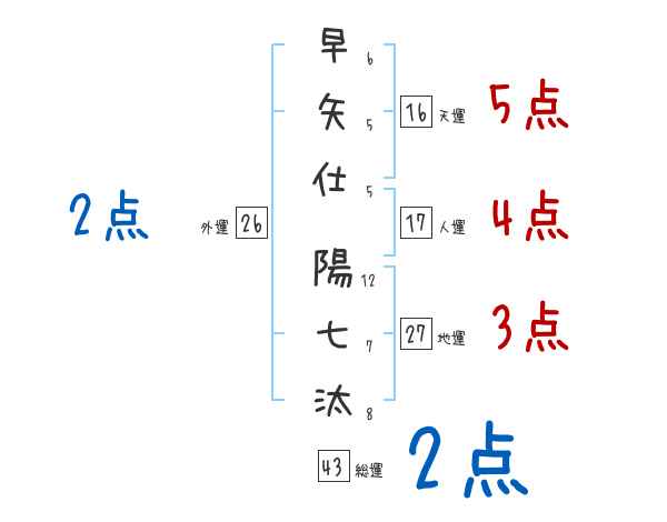 天運![]() | 早矢仕陽七汰さんの天運は16画の5つ星!人望が厚く大きく発展する。逆転成功が見える。 家系が持つ宿命的な運勢を表します。祖先から受け継いだ苗字ですので自分の力が及びません。家柄を象徴します。 |