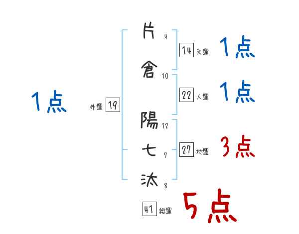 外運![]() | 片倉陽七汰さんの外運は19画の1つ星!優れた才能を持ちますが、協調性が足りないことも。周りの人と協力する事を意識しましょう。 生活面を象徴する運勢です。外部から受ける影響力を表し、結婚運、家庭運や職場、環境への順応性を表します。 |