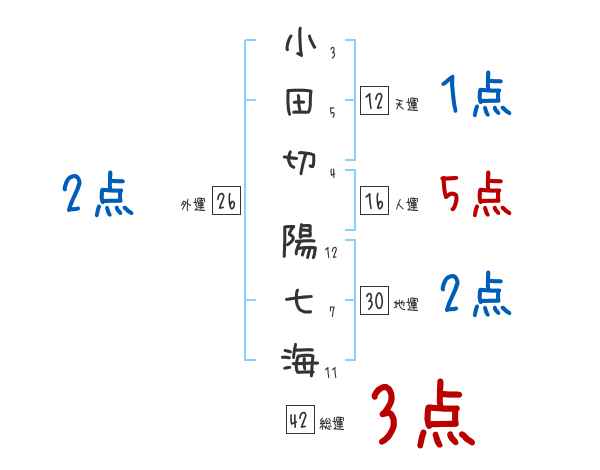 外運![]() | 小田切陽七海さんの外運は26画の2つ星!波瀾万丈かも。信頼できる人を大事にしましょう。 生活面を象徴する運勢です。外部から受ける影響力を表し、結婚運、家庭運や職場、環境への順応性を表します。 |