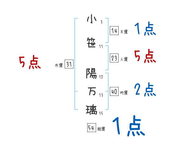 天運![]() | 小笹陽万璃さんの天運は14画の1つ星!人に対して優しいがストレスを溜め込みがち。人間関係のトラブルを避けるよう気をつけましょう。 家系が持つ宿命的な運勢を表します。祖先から受け継いだ苗字ですので自分の力が及びません。家柄を象徴します。 |