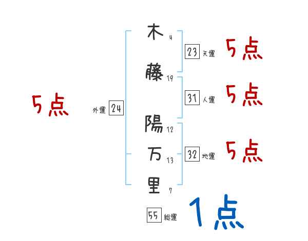 外運![]() | 木藤陽万里さんの外運は24画の5つ星!家庭運が良く順調な人生。金運にも恵まれる。 生活面を象徴する運勢です。外部から受ける影響力を表し、結婚運、家庭運や職場、環境への順応性を表します。 |