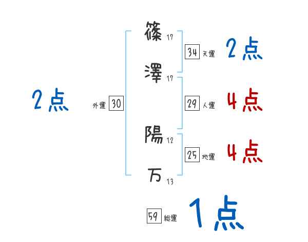 外運![]() | 篠澤陽万さんの外運は30画の2つ星!浮き沈みの激しさに注意しましょう。 生活面を象徴する運勢です。外部から受ける影響力を表し、結婚運、家庭運や職場、環境への順応性を表します。 |
