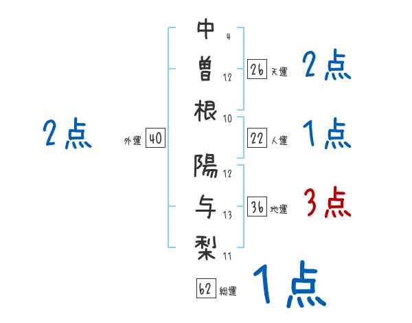 総運![]() | 中曽根陽与梨さんの総運は62画の1つ星!困難なトラブルが多く精神的に疲労しないように気をつけましょう。 あなたの人生を表す1番重要な運勢です。生涯を通じて影響する総合運となり、主に50歳以降の晩年期に影響を及ぼします。 |