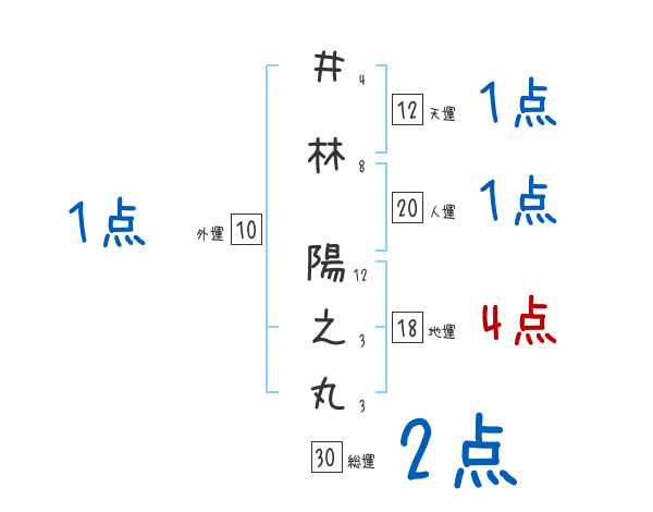 天運![]() | 井林陽之丸さんの天運は12画の1つ星!簡単な失敗で諦めてしまいやすいかも。着実に行動すると良いでしょう。 家系が持つ宿命的な運勢を表します。祖先から受け継いだ苗字ですので自分の力が及びません。家柄を象徴します。 |