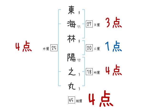 地運![]() | 東海林陽之丸さんの地運は18画の4つ星!情熱的で剛気。忍耐力があり信頼される。 個性を表す基礎的な運勢です。性格形成や対人関係、行動力など家庭環境に影響されます。主に誕生してから20歳くらいまでの若年期の運勢を表します。 |