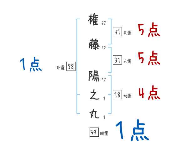 天運![]() | 権藤陽之丸さんの天運は41画の5つ星!大志を抱き、目標に向かって実力を発揮し達成する。温和な性格。 家系が持つ宿命的な運勢を表します。祖先から受け継いだ苗字ですので自分の力が及びません。家柄を象徴します。 |