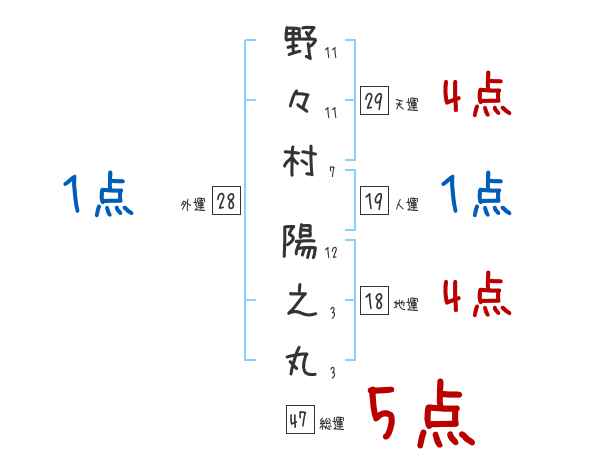 総運![]() | 野々村陽之丸さんの総運は47画の5つ星!実力が開花し発展する円満な人生。財に恵まれる。 あなたの人生を表す1番重要な運勢です。生涯を通じて影響する総合運となり、主に50歳以降の晩年期に影響を及ぼします。 |
