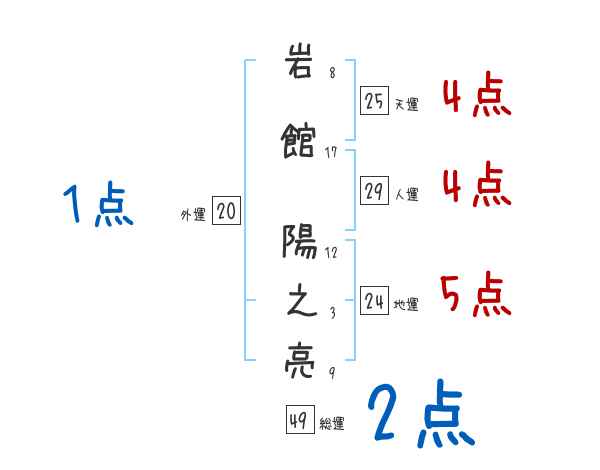 人運![]() | 岩館陽之亮さんの人運は29画の4つ星!完全主義で才能がある。厳格な心の持ち主。 性格や才能などを表す2番目に重要な運勢です。人間関係や協調性、社会的な成功に影響します。主に20歳から50歳ぐらいまでの中年期の運勢を表します。 |