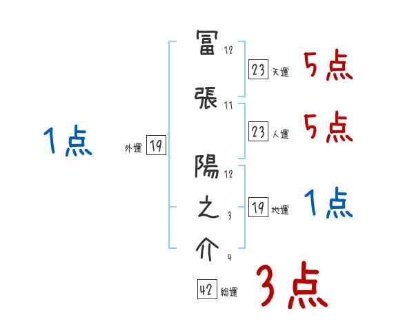 天運![]() | 冨張陽之介さんの天運は23画の5つ星!想像力に優れ活力がある。一代で成功し名誉を手に入れる。 家系が持つ宿命的な運勢を表します。祖先から受け継いだ苗字ですので自分の力が及びません。家柄を象徴します。 |