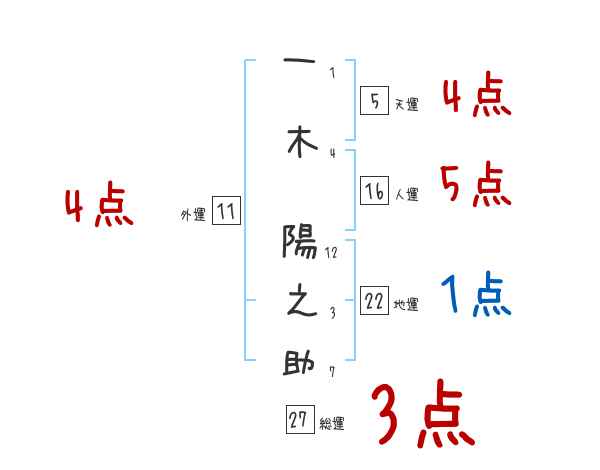 人運![]() | 一木陽之助さんの人運は16画の5つ星!人望が厚く大きく発展する。逆転成功が見える。 性格や才能などを表す2番目に重要な運勢です。人間関係や協調性、社会的な成功に影響します。主に20歳から50歳ぐらいまでの中年期の運勢を表します。 |