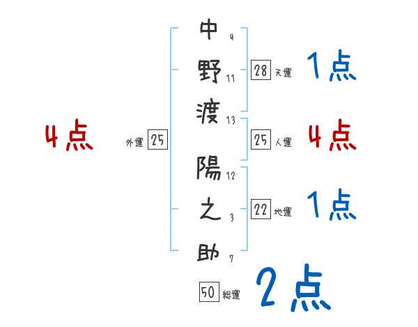 天運![]() | 中野渡陽之助さんの天運は28画の1つ星!家庭環境に注意。スポーツで活躍できる能力があるかも。 家系が持つ宿命的な運勢を表します。祖先から受け継いだ苗字ですので自分の力が及びません。家柄を象徴します。 |