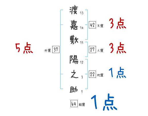 外運![]() | 渡嘉敷陽之助さんの外運は37画の5つ星!努力家で順応性に優れる。現実的な考え方ができ忠実に物事をこなす。 生活面を象徴する運勢です。外部から受ける影響力を表し、結婚運、家庭運や職場、環境への順応性を表します。 |