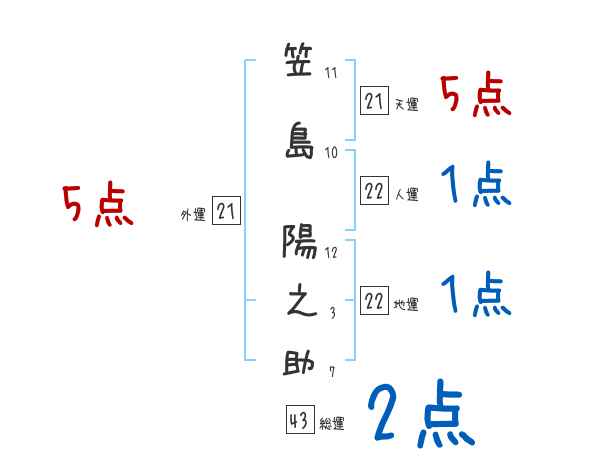 外運![]() | 笠島陽之助さんの外運は21画の5つ星!統率力がある。独立し成功する。名誉を手に入れる。 生活面を象徴する運勢です。外部から受ける影響力を表し、結婚運、家庭運や職場、環境への順応性を表します。 |