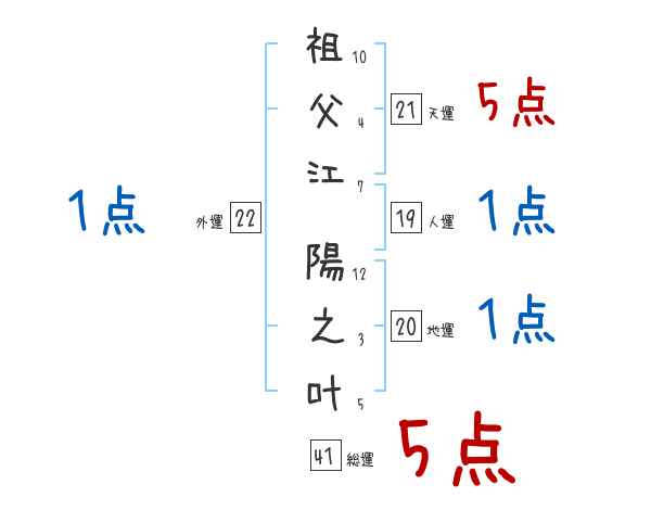 天運![]() | 祖父江陽之叶さんの天運は21画の5つ星!統率力がある。独立し成功する。名誉を手に入れる。 家系が持つ宿命的な運勢を表します。祖先から受け継いだ苗字ですので自分の力が及びません。家柄を象徴します。 |