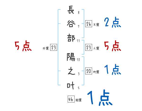 天運![]() | 長谷部陽之叶さんの天運は26画の2つ星!波瀾万丈かも。信頼できる人を大事にしましょう。 家系が持つ宿命的な運勢を表します。祖先から受け継いだ苗字ですので自分の力が及びません。家柄を象徴します。 |