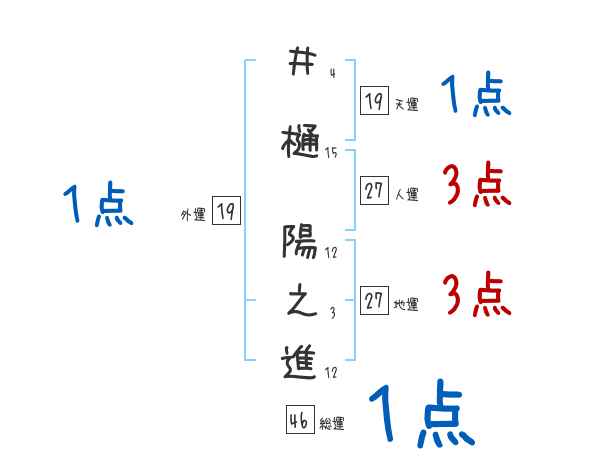 地運![]() | 井樋陽之進さんの地運は27画の3つ星!頭脳明晰だが強情で摩擦が多い傾向。孤立に注意。 個性を表す基礎的な運勢です。性格形成や対人関係、行動力など家庭環境に影響されます。主に誕生してから20歳くらいまでの若年期の運勢を表します。 |