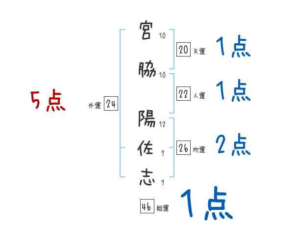 人運![]() | 宮脇陽佐志さんの人運は22画の1つ星!努力することが苦手ないっぽう手先が器用。芸術性にも優れる。 性格や才能などを表す2番目に重要な運勢です。人間関係や協調性、社会的な成功に影響します。主に20歳から50歳ぐらいまでの中年期の運勢を表します。 |