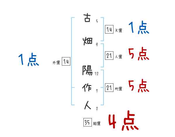 天運![]() | 古畑陽作人さんの天運は14画の1つ星!人に対して優しいがストレスを溜め込みがち。人間関係のトラブルを避けるよう気をつけましょう。 家系が持つ宿命的な運勢を表します。祖先から受け継いだ苗字ですので自分の力が及びません。家柄を象徴します。 |