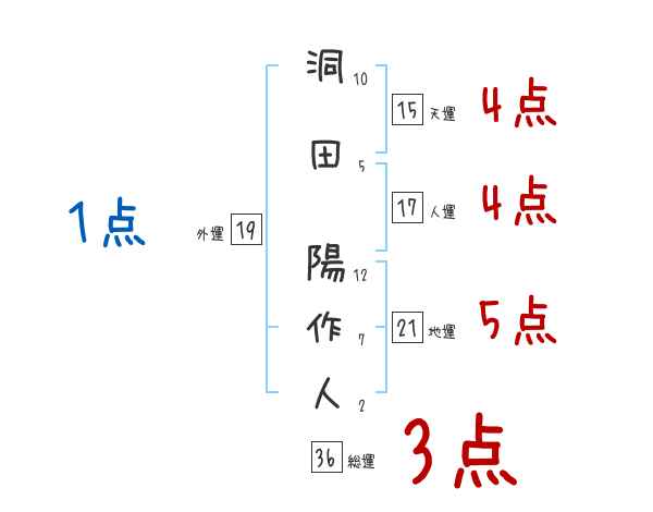 総運![]() | 洞田陽作人さんの総運は36画の3つ星!先見性が豊かです。多少神経質で苦労することも。 あなたの人生を表す1番重要な運勢です。生涯を通じて影響する総合運となり、主に50歳以降の晩年期に影響を及ぼします。 |