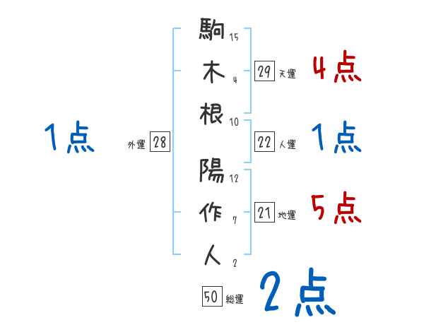 天運![]() | 駒木根陽作人さんの天運は29画の4つ星!完全主義で才能がある。厳格な心の持ち主。 家系が持つ宿命的な運勢を表します。祖先から受け継いだ苗字ですので自分の力が及びません。家柄を象徴します。 |