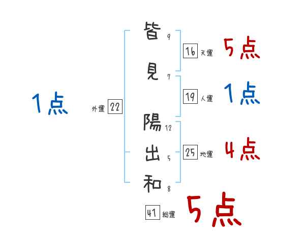 外運![]() | 皆見陽出和さんの外運は22画の1つ星!努力することが苦手ないっぽう手先が器用。芸術性にも優れる。 生活面を象徴する運勢です。外部から受ける影響力を表し、結婚運、家庭運や職場、環境への順応性を表します。 |