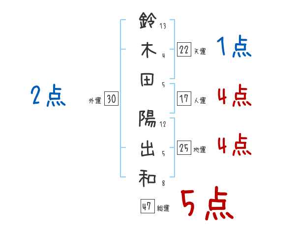 総運![]() | 鈴木田陽出和さんの総運は47画の5つ星!実力が開花し発展する円満な人生。財に恵まれる。 あなたの人生を表す1番重要な運勢です。生涯を通じて影響する総合運となり、主に50歳以降の晩年期に影響を及ぼします。 |