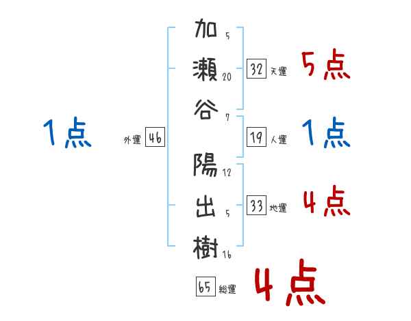 天運![]() | 加瀬谷陽出樹さんの天運は32画の5つ星!柔軟性があり成功する。チャンスが多く金運が良い。 家系が持つ宿命的な運勢を表します。祖先から受け継いだ苗字ですので自分の力が及びません。家柄を象徴します。 |
