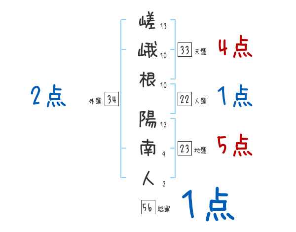 天運![]() | 嵯峨根陽南人さんの天運は33画の4つ星!権力志向でプライドが高い。勇気があり運を切り開き成功する。 家系が持つ宿命的な運勢を表します。祖先から受け継いだ苗字ですので自分の力が及びません。家柄を象徴します。 |