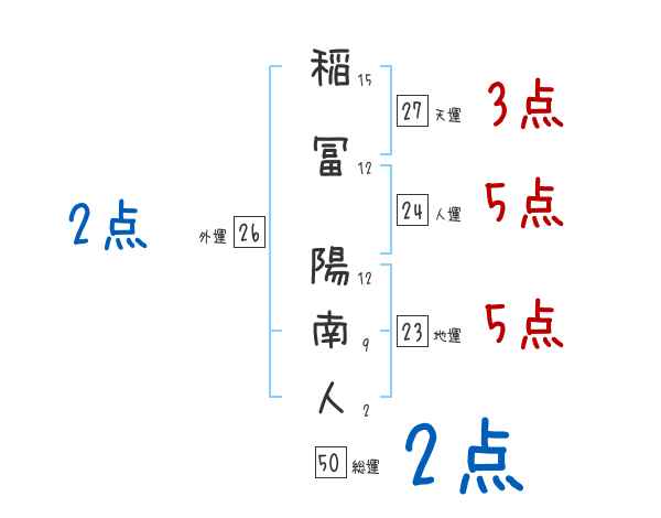 外運![]() | 稲冨陽南人さんの外運は26画の2つ星!波瀾万丈かも。信頼できる人を大事にしましょう。 生活面を象徴する運勢です。外部から受ける影響力を表し、結婚運、家庭運や職場、環境への順応性を表します。 |