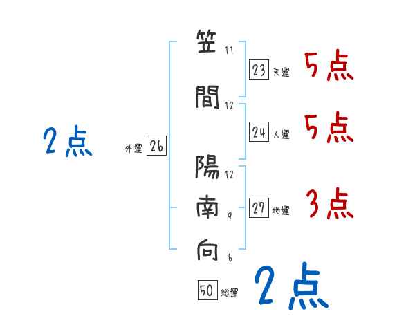天運![]() | 笠間陽南向さんの天運は23画の5つ星!想像力に優れ活力がある。一代で成功し名誉を手に入れる。 家系が持つ宿命的な運勢を表します。祖先から受け継いだ苗字ですので自分の力が及びません。家柄を象徴します。 |