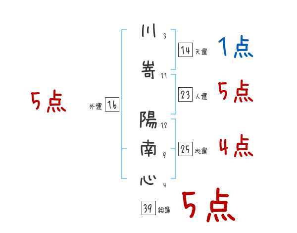 人運![]() | 川嵜陽南心さんの人運は23画の5つ星!想像力に優れ活力がある。一代で成功し名誉を手に入れる。 性格や才能などを表す2番目に重要な運勢です。人間関係や協調性、社会的な成功に影響します。主に20歳から50歳ぐらいまでの中年期の運勢を表します。 |