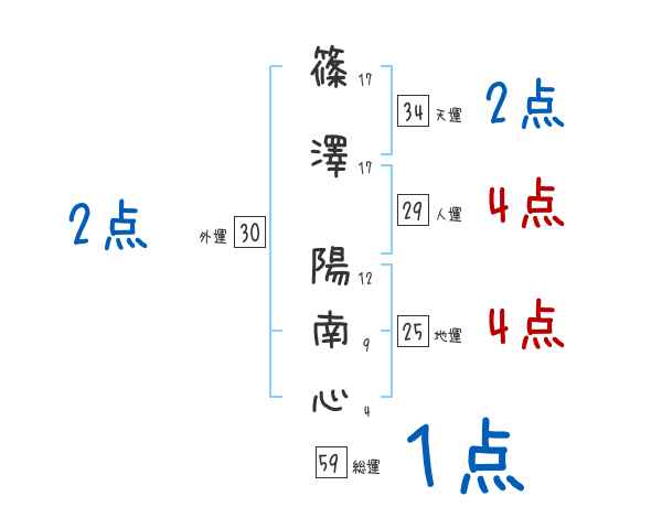天運![]() | 篠澤陽南心さんの天運は34画の2つ星!独創性に優れるが、自尊心が強く災難に注意しましょう。 家系が持つ宿命的な運勢を表します。祖先から受け継いだ苗字ですので自分の力が及びません。家柄を象徴します。 |