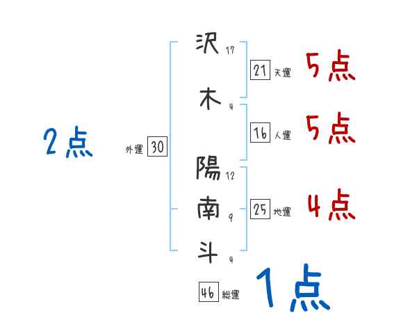 天運![]() | 沢木陽南斗さんの天運は21画の5つ星!統率力がある。独立し成功する。名誉を手に入れる。 家系が持つ宿命的な運勢を表します。祖先から受け継いだ苗字ですので自分の力が及びません。家柄を象徴します。 |