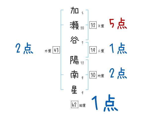 天運![]() | 加瀬谷陽南星さんの天運は32画の5つ星!柔軟性があり成功する。チャンスが多く金運が良い。 家系が持つ宿命的な運勢を表します。祖先から受け継いだ苗字ですので自分の力が及びません。家柄を象徴します。 |
