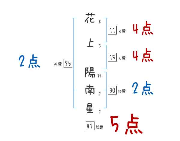 天運![]() | 花上陽南星さんの天運は11画の4つ星!着実に富や地位を得る幸運な人生。 家系が持つ宿命的な運勢を表します。祖先から受け継いだ苗字ですので自分の力が及びません。家柄を象徴します。 |