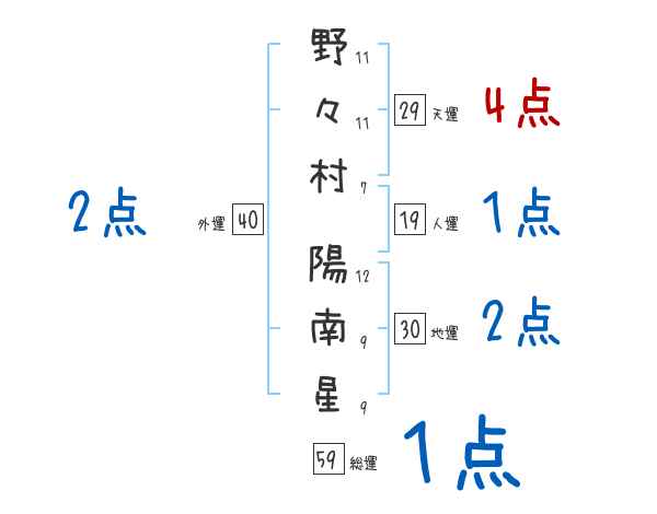 天運![]() | 野々村陽南星さんの天運は29画の4つ星!完全主義で才能がある。厳格な心の持ち主。 家系が持つ宿命的な運勢を表します。祖先から受け継いだ苗字ですので自分の力が及びません。家柄を象徴します。 |