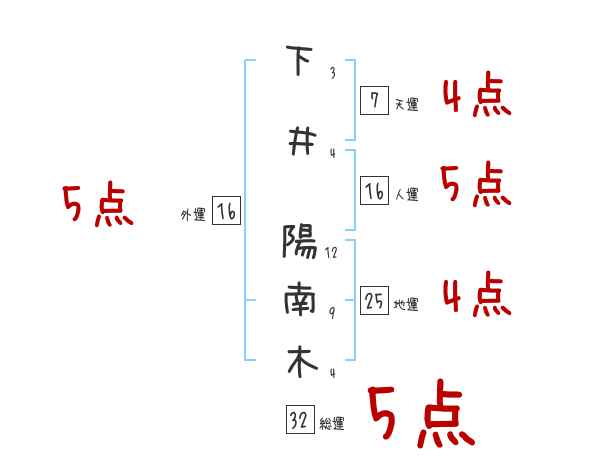 外運![]() | 下井陽南木さんの外運は16画の5つ星!人望が厚く大きく発展する。逆転成功が見える。 生活面を象徴する運勢です。外部から受ける影響力を表し、結婚運、家庭運や職場、環境への順応性を表します。 |