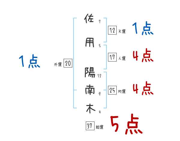 天運![]() | 佐用陽南木さんの天運は12画の1つ星!簡単な失敗で諦めてしまいやすいかも。着実に行動すると良いでしょう。 家系が持つ宿命的な運勢を表します。祖先から受け継いだ苗字ですので自分の力が及びません。家柄を象徴します。 |