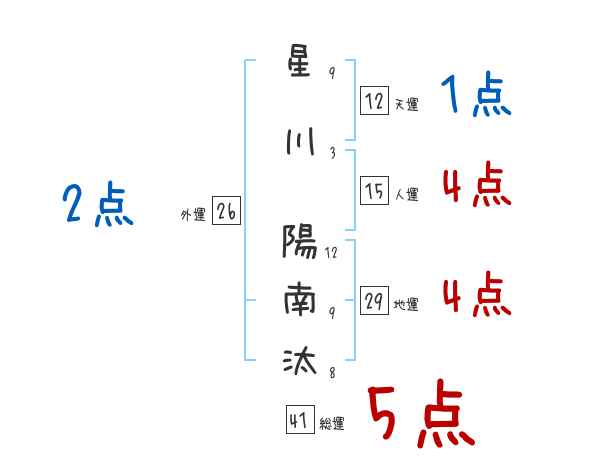 外運![]() | 星川陽南汰さんの外運は26画の2つ星!波瀾万丈かも。信頼できる人を大事にしましょう。 生活面を象徴する運勢です。外部から受ける影響力を表し、結婚運、家庭運や職場、環境への順応性を表します。 |