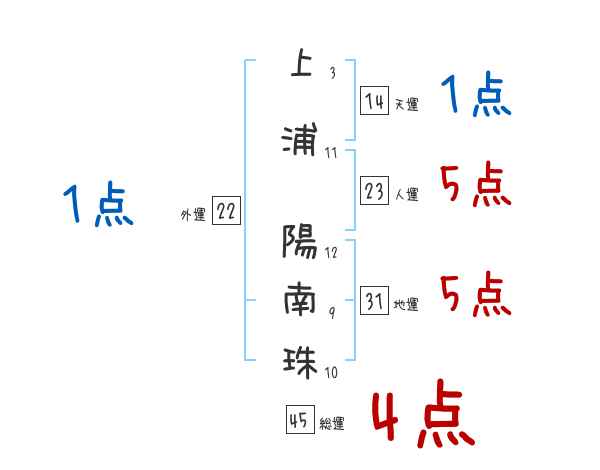 天運![]() | 上浦陽南珠さんの天運は14画の1つ星!人に対して優しいがストレスを溜め込みがち。人間関係のトラブルを避けるよう気をつけましょう。 家系が持つ宿命的な運勢を表します。祖先から受け継いだ苗字ですので自分の力が及びません。家柄を象徴します。 |