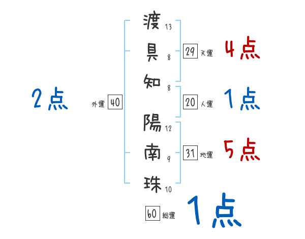 天運![]() | 渡具知陽南珠さんの天運は29画の4つ星!完全主義で才能がある。厳格な心の持ち主。 家系が持つ宿命的な運勢を表します。祖先から受け継いだ苗字ですので自分の力が及びません。家柄を象徴します。 |