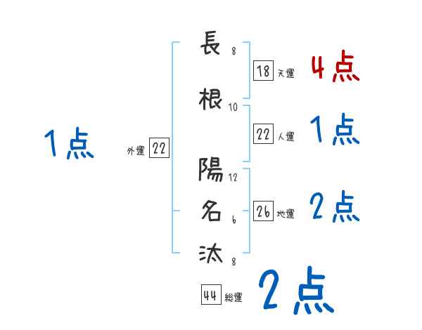 天運![]() | 長根陽名汰さんの天運は18画の4つ星!情熱的で剛気。忍耐力があり信頼される。 家系が持つ宿命的な運勢を表します。祖先から受け継いだ苗字ですので自分の力が及びません。家柄を象徴します。 |