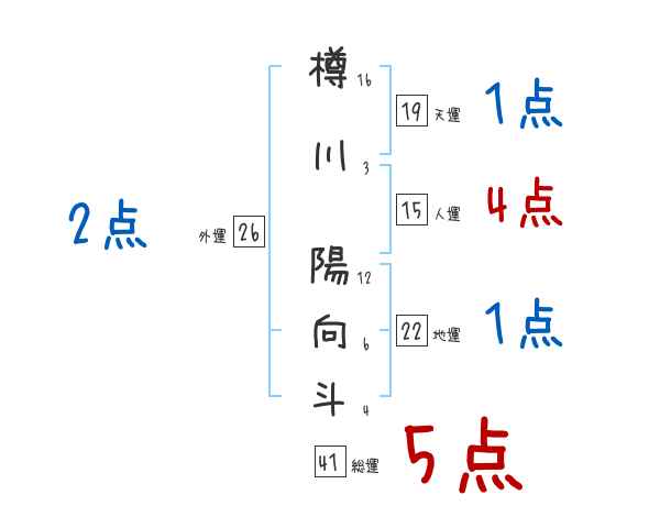 外運![]() | 樽川陽向斗さんの外運は26画の2つ星!波瀾万丈かも。信頼できる人を大事にしましょう。 生活面を象徴する運勢です。外部から受ける影響力を表し、結婚運、家庭運や職場、環境への順応性を表します。 |