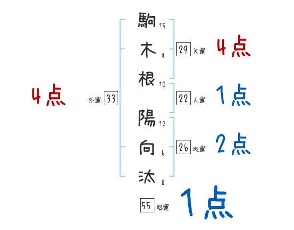 天運![]() | 駒木根陽向汰さんの天運は29画の4つ星!完全主義で才能がある。厳格な心の持ち主。 家系が持つ宿命的な運勢を表します。祖先から受け継いだ苗字ですので自分の力が及びません。家柄を象徴します。 |